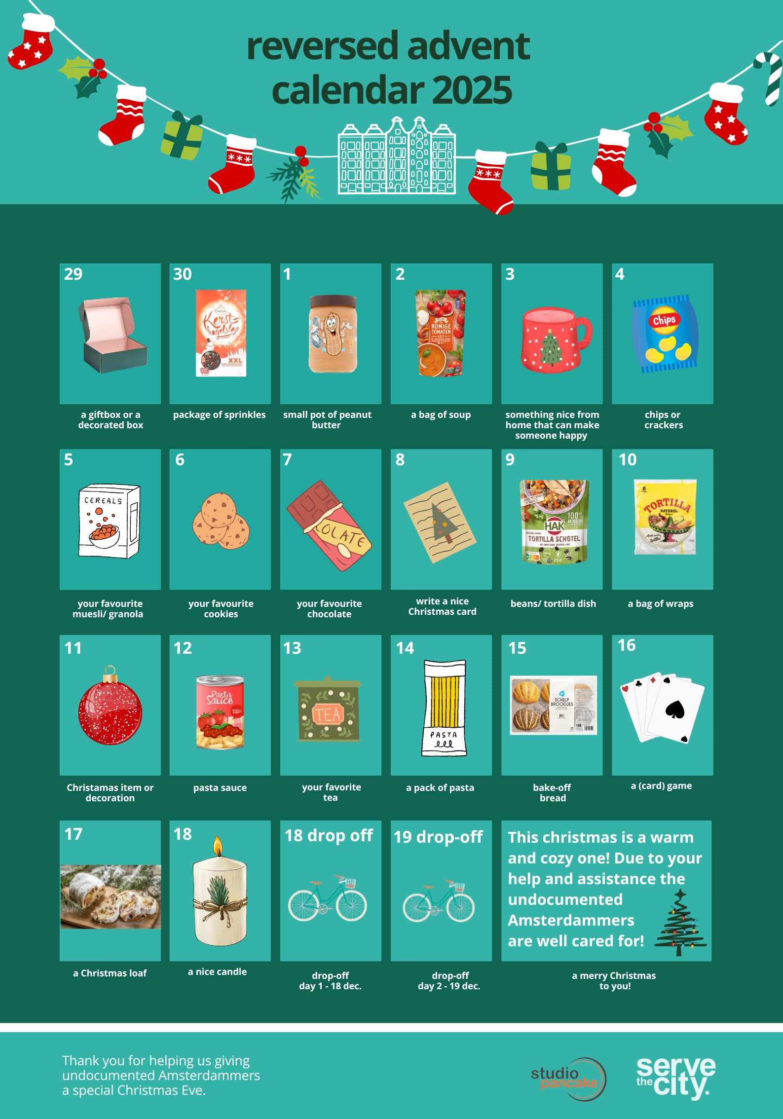 In 2024, more than 500 volunteers participated in our “Reverse Advent Calendar” campaign, resulting in 1,000 personalized Christmas boxes lovingly put together for undocumented people in Amsterdam. In 2025, we’re bringing this initiative back. We’d love for you, your company, your street, or your school class to join in!
