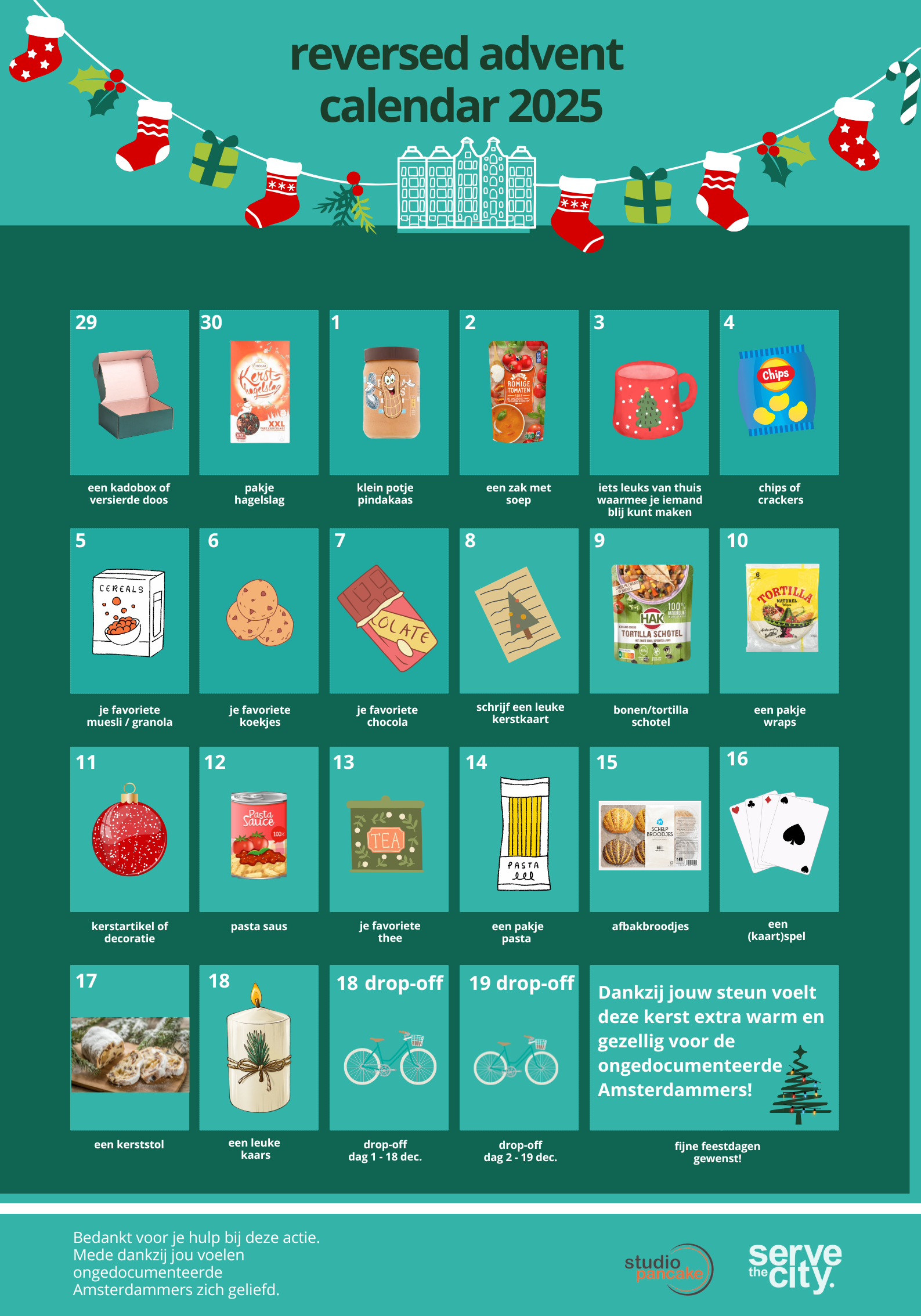 Wil je met kerst 2025 iets moois voor een ander doen? Dat kan! In 2024 deden meer dan 500 vrijwilligers mee met onze ‘Omgekeerde Adventskalender’ actie met als resultaat 1000 persoonlijke kerstpakketten die met liefde waren samengesteld voor een ongedocumenteerde Amsterdammer. In 2025 gaan we deze actie weer doen. Leuk als jij, je bedrijf, je straat of schoolklas meedoet.